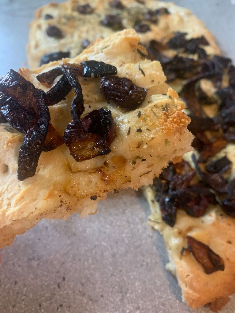 This gluten free focaccia was one of my favorites to make during the beginning of quarantine – like so many others, I was on quite the bread-making kick! It took me awhile to figure out the right ratio of dry vs. liquid ingredients so it didn’t come out too mushy or not fully cooked, but I can confidently say that this recipe is a winner! The gluten free focaccia great without toppings, but tastes really amazing topped with kalamata olives and caramelized onions.